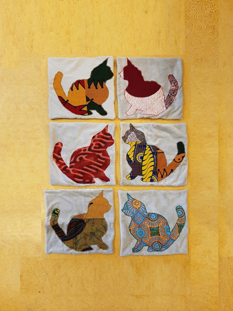Nogmaals op verzoek van het dierenasiel Helmond maken wij nieuwe kattematjes. Ze worden steeds mooier. Het is leuk als ook de katjes van Vlisco gaan houden. Marleen heeft ze gemaakt.